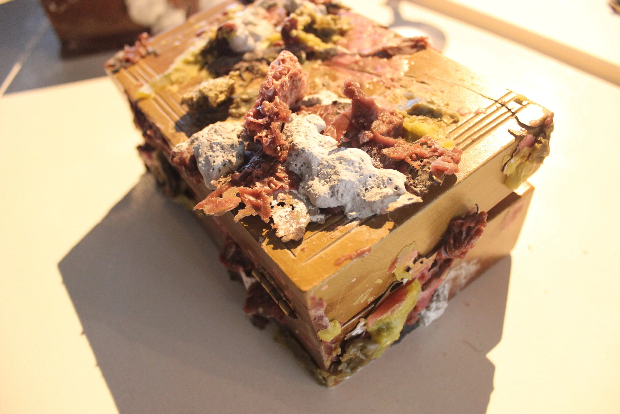 “The work consists of three jewellery or treasure boxes, each representing a different potential stage of ocean acidification. The whimsical idea of deep-sea treasure pulled from the depths draws the viewer in to explore each box, with the element of discovery adding excitement and curiosity. The first box, covered in a healthy growth of bright crustose coralline algae, is filled with an abundance of paua jewellery. The most sensitive time for paua is at the larval stage, in which they settle and grow on coralline algae. The invertebrate can take up to ten years to mature, growing the distinct blue-green shimmering shell seen in every souvenir shop. Paua shell has the status of a prized national icon, and in Maori culture is considered taonga, while simultaneously being consumed as mass-produced kitsch jewellery and ashtrays. It is this lack of value placed on common species that makes them vulnerable.