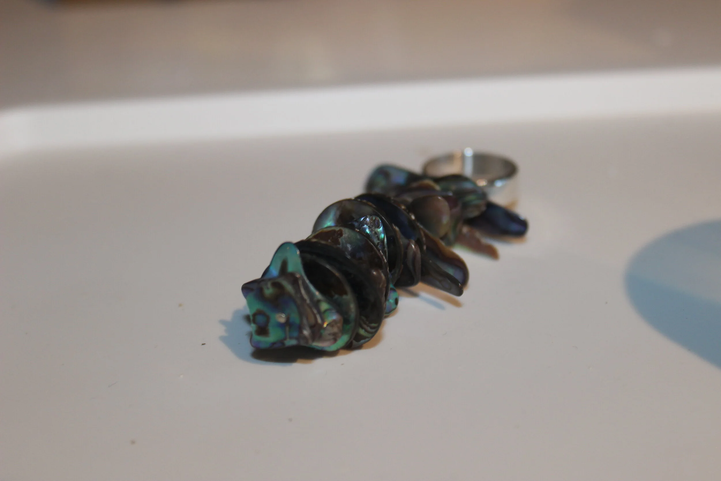In the second box, the pink crusty growth has been replaced with brown algae, which might be more competitive in the future. Paua larvae settles on crustose coralline algae, so an ocean without these building blocks is tougher to survive in. A once common species could become endangered. The box contains one precious object as a warning to protect what we currently take for granted: a pair of glasses with rotating disc-like ‘lenses.’ One side is paua and, when turned, the other side shows a cluster of pink coralline algae, representing the two species’ reliance on each other. The wearer struggles to see something when it is so close to their face, reminiscent of the adage, “I can’t see the forest for the trees.” The glasses reflect our struggle to understand complex ecological relationships in what feels like a race against an exponentially growing problem. Inspiration to make a pair of glasses came from the desire to immerse the wearer. Immersion need not involve the wearer’s full body. By covering their eyes, they are given a sense of total immersion. This idea stems from a quote by founder of Parley for the Oceans, Cyrill Gutsch – “We want to people to get their heads underwater” – urging us to think more about the ocean, experience the ocean, and consider invisible issues like OA. Further inspiration for the glasses comes from traditional Maori carving. Paua shell is used on eyes to represent the eyes of our ancestors looking down from the night sky. In terms of climate change and ocean acidification, we are the eyes looking forward for future generations.